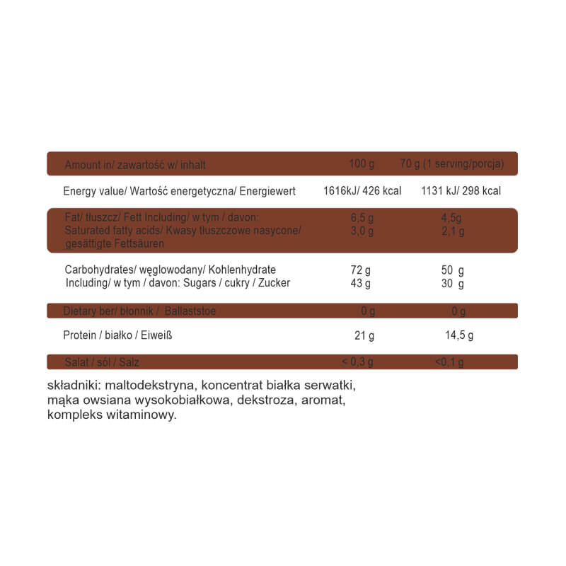 • Bogaty w wysokokaloryczny kompleks węglowodanowy z dodatkiem białka roślinnego i zwierzęcego.